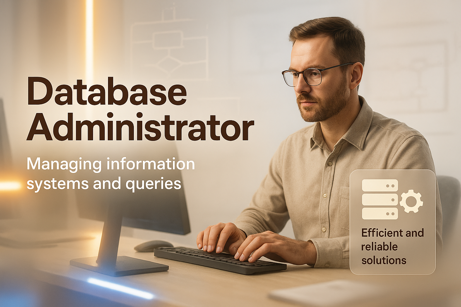 A focused database administrator working at a computer, showcasing a modern office environment. Ideal for tech-related content and recruitment materials.