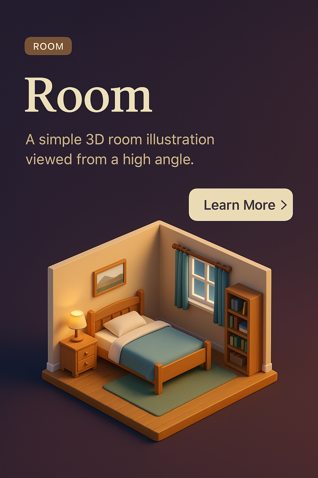 /Collection: /by davooda/Type: PNG/A visually appealing 3D illustration of a cozy room viewed from a high angle. The scene features a bed, bookshelf, and lamp, all set against a dark gradient background.