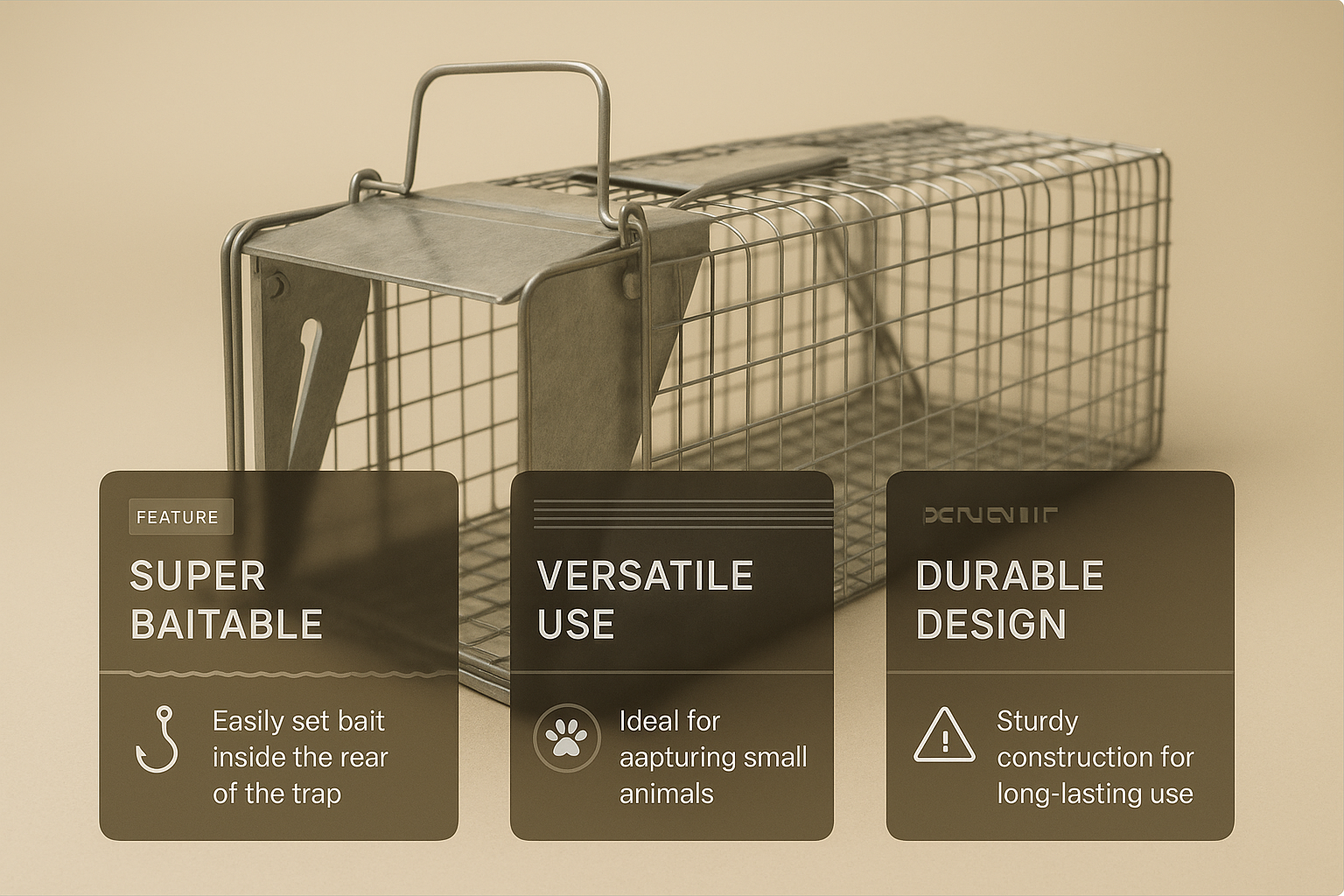 /Collection: /by davooda/Type: PNG/A stylish animal trap illustration featuring a metal cage design. Accompanied by informative blocks highlighting features in a cohesive layout with a light background.