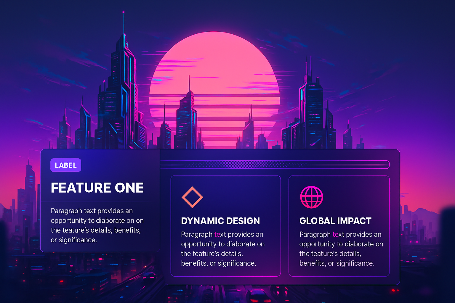 /Collection: /by davooda/Type: PNG/A vibrant cyberpunk cityscape features a glowing sunset with towering skyscrapers. The design includes dynamic text blocks and graphical elements, enhancing the futuristic aesthetic.