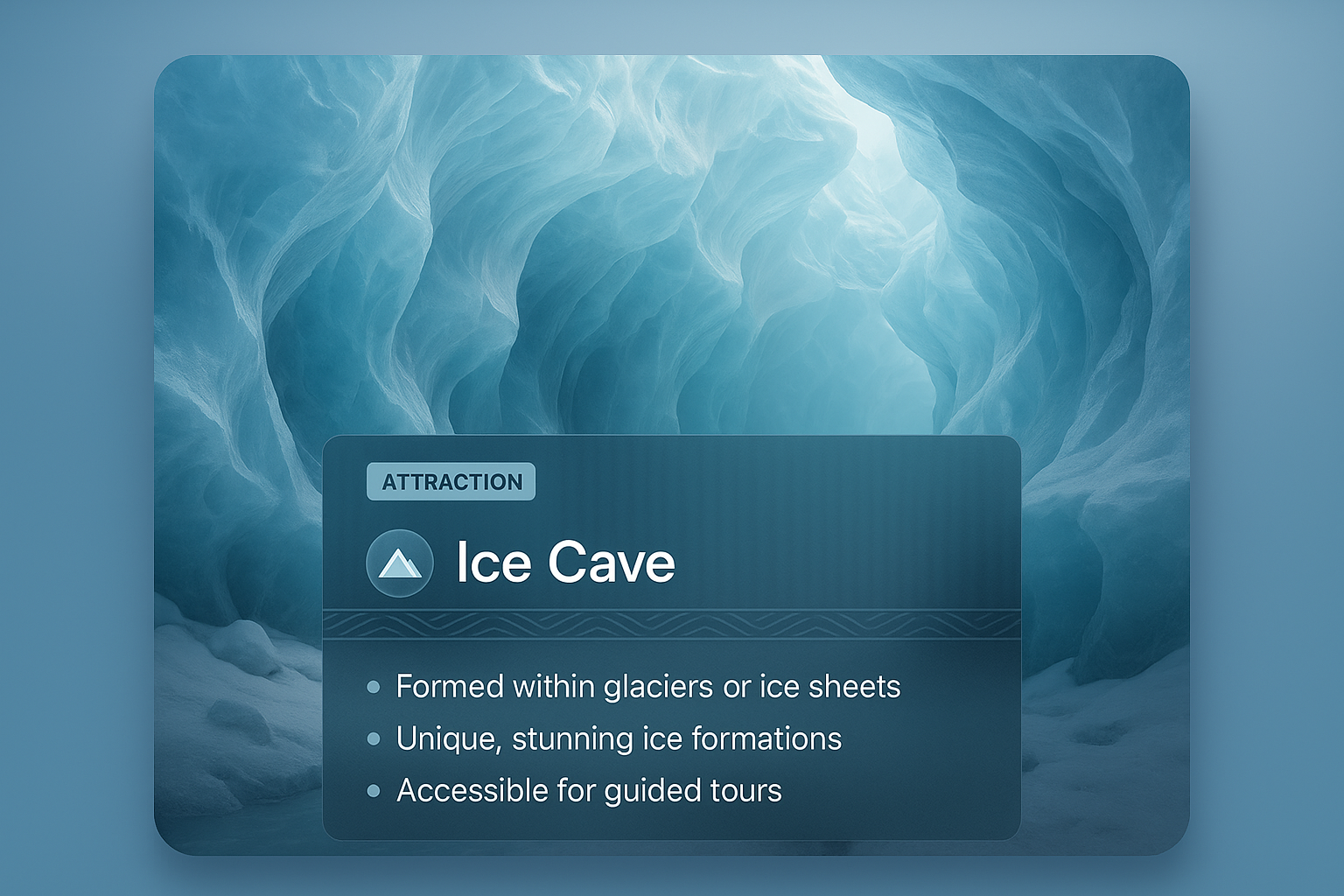 An ethereal ice cave featuring intricate blue ice formations. Overlaid with an informative panel highlighting unique attributes and accessibility for tours.