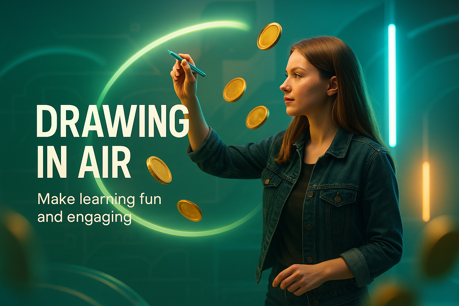 /Collection: /by davooda/Type: PNG/Engaging image illustrating a woman actively participating in a creative learning experience, featuring vibrant colors and dynamic light effects, ideal for educational marketing.