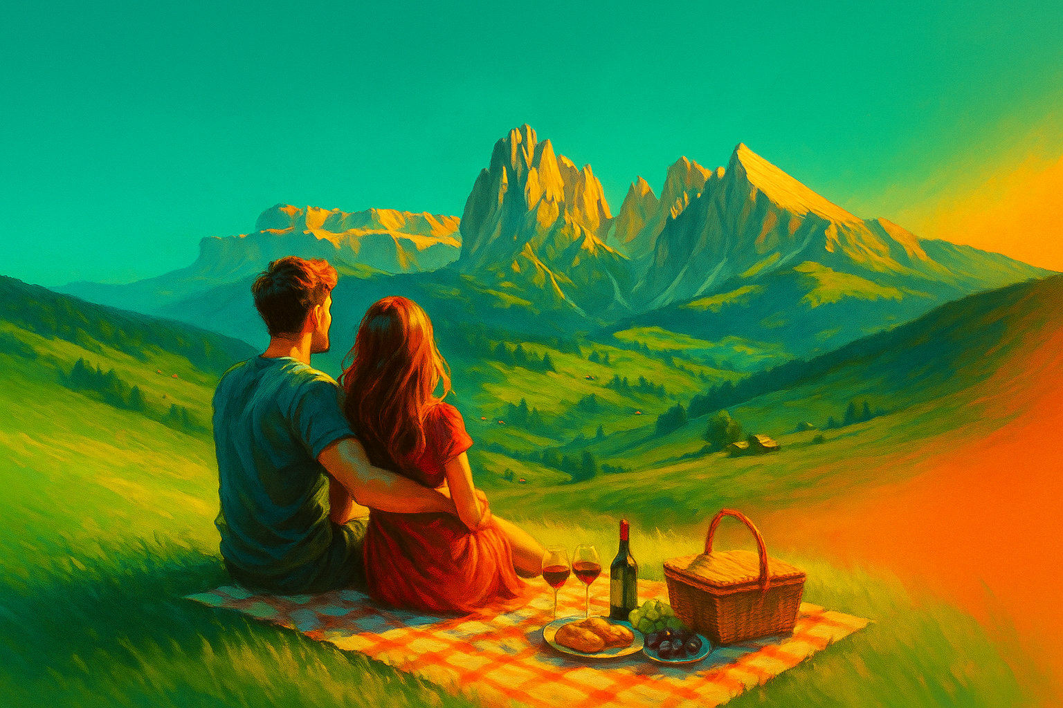 /Collection: /by davooda/Type: PNG/A young couple enjoys a romantic picnic in the Dolomites, seated on a blanket with a picturesque green meadow and mountain backdrop, beautifully lit from both sides.