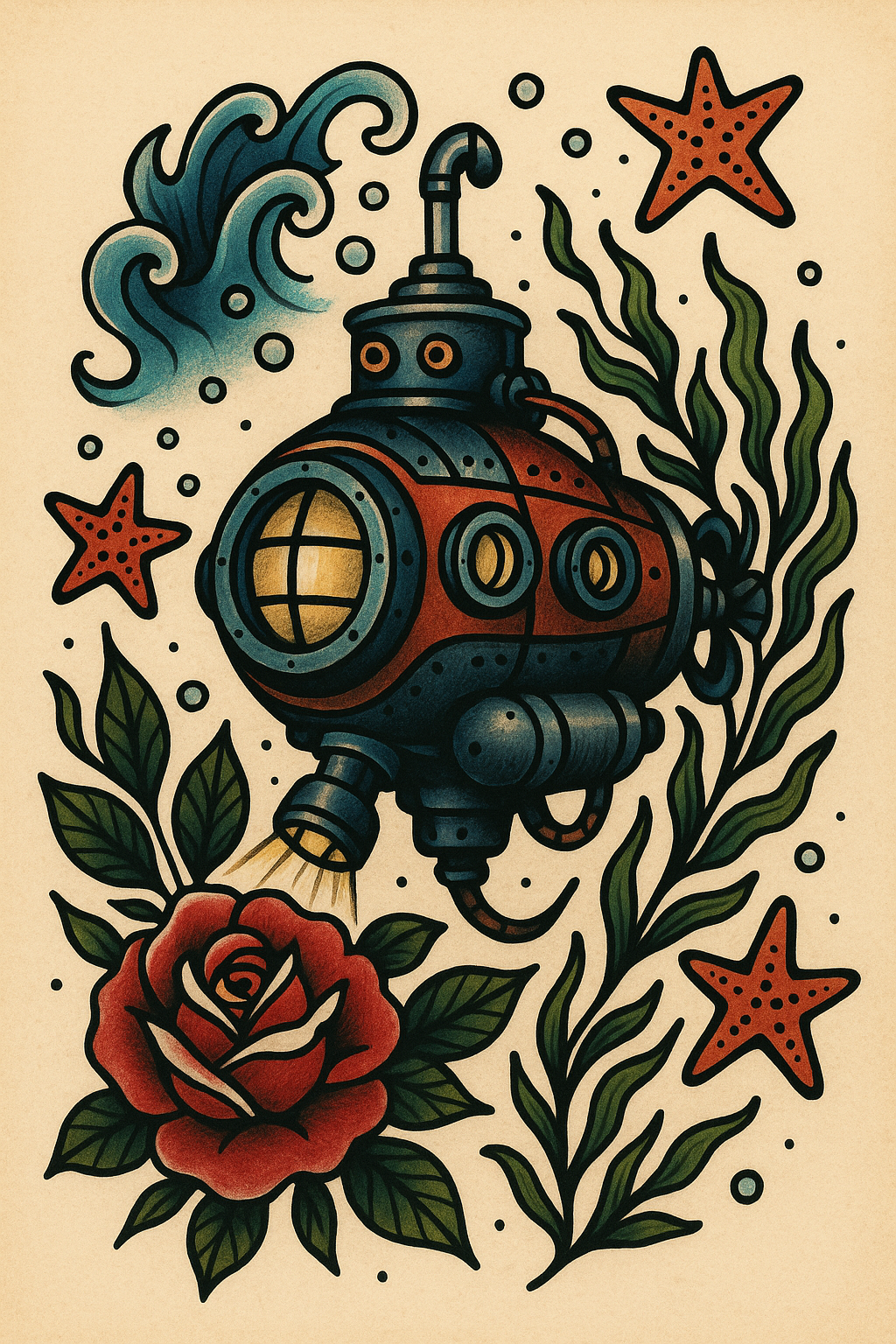 Vintage Submarine Illustration with Floral Elements