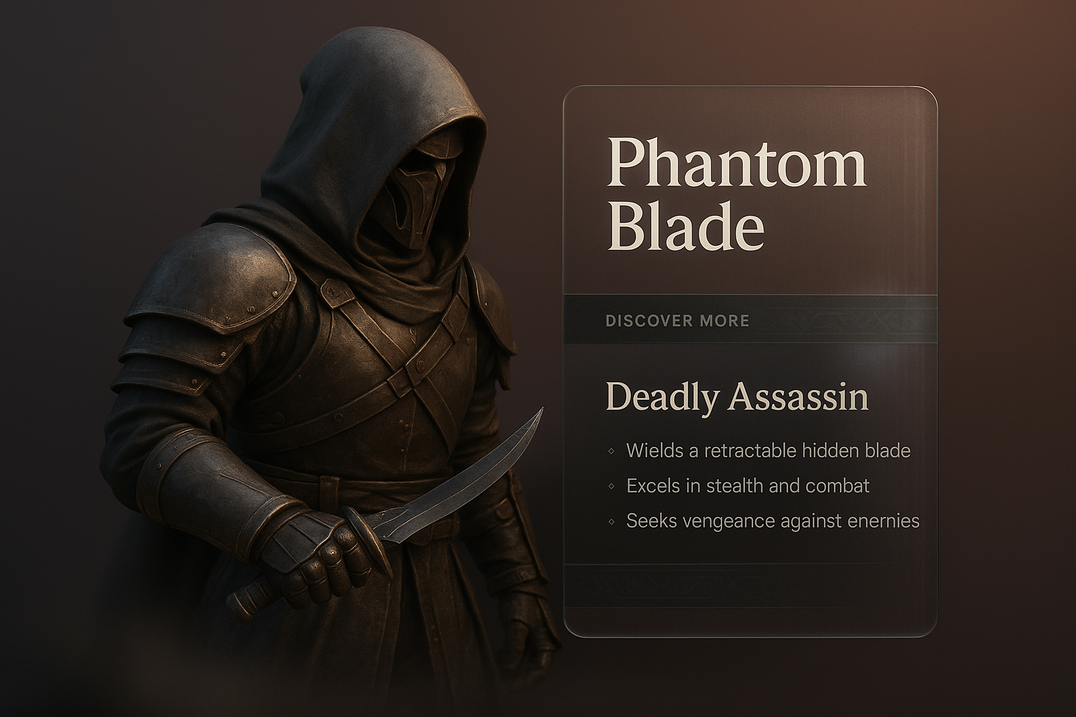 /Collection: /by davooda/Type: PNG/A striking 3D illustration of the Phantom Blade character, showcasing a mysterious assassin with a retractable blade. The design features a dark overlay for text integration.