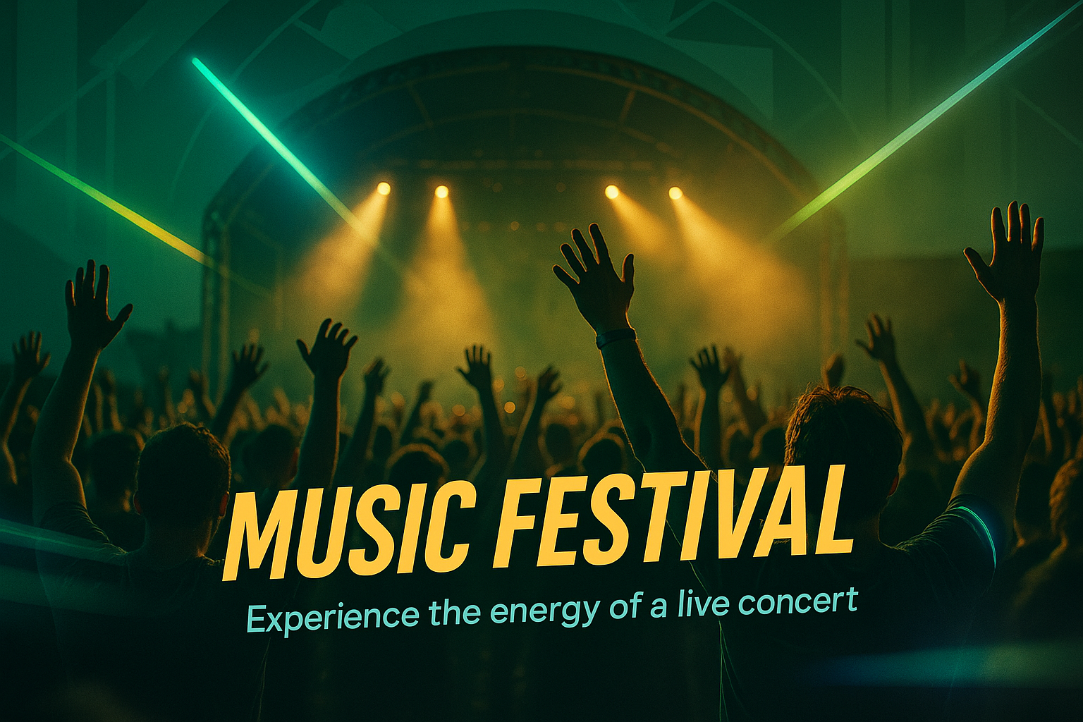 Dynamic promotional image for a music festival featuring a lively concert scene with raised hands and vibrant lighting effects, ideal for event marketing.