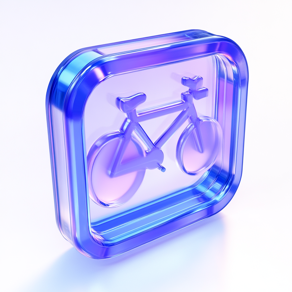 Modern and sleek 3D bicycle icon rendered in a translucent purple design, suitable for applications related to cycling, fitness, or transportation.