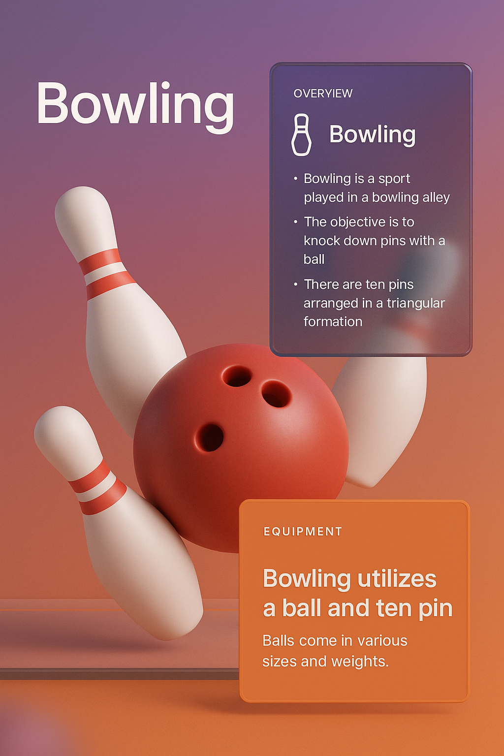 /Collection: /by davooda/Type: PNG/A 3D illustration of bowling featuring a bowling ball and pins, complemented by two informational blocks. The background showcases a smooth gradient, enhancing the visual appeal.