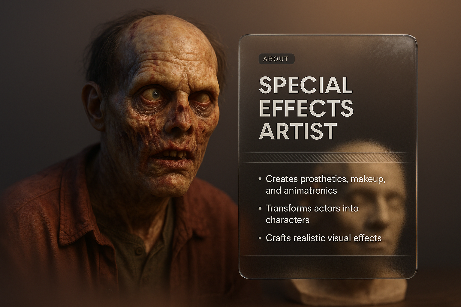 /Collection: /by davooda/Type: PNG/A detailed 3D illustration of a special effects artist showcasing realistic facial features, paired with an integrated transparent overlay containing information about the artist's work.