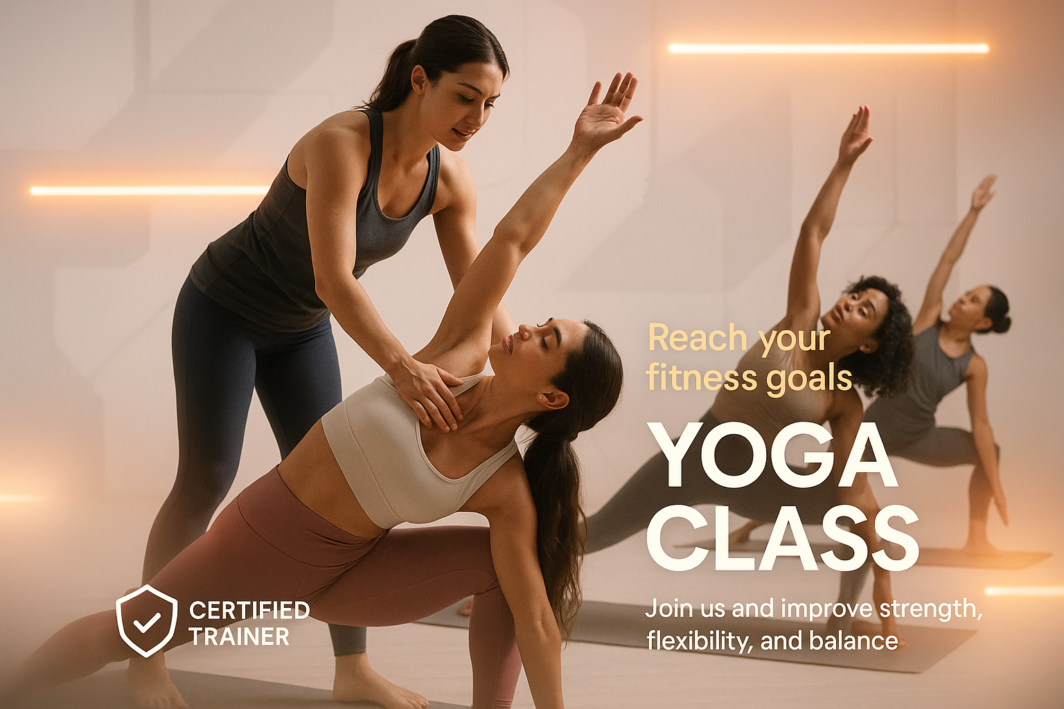 /Collection: /by davooda/Type: PNG/Engaging promotional graphic for a yoga class featuring a certified trainer assisting a student. The modern design and warm tones aim to attract fitness enthusiasts seeking improvement in strength and flexibility.