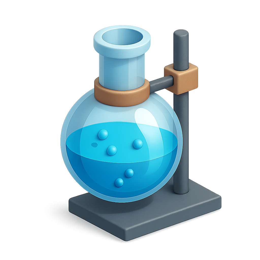 /Collection: /by davooda/Type: PNG/This image showcases a 3D chemical apparatus icon featuring a round flask with a blue liquid, set in a three-quarter view. The design includes a stand and a connecting tube, all rendered with a transparent background and isometric perspective.