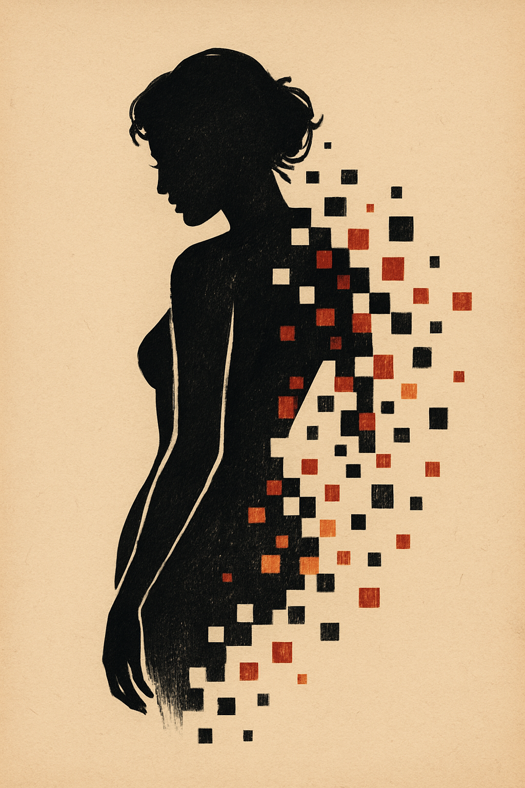 /Collection: /by davooda/Type: PNG/A creative tattoo design featuring a silhouette of a woman dissolving into pixelated squares. The artwork is set against a light beige background, enhancing the colors.