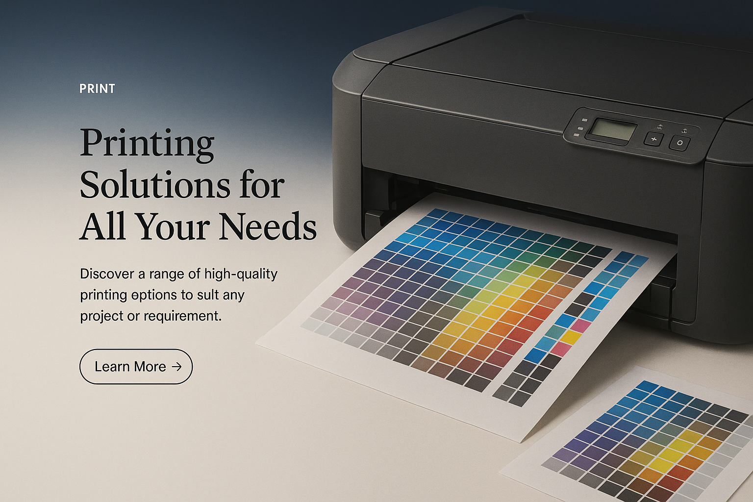 A modern web design layout featuring a printer with a colorful printout. The design includes a clear call-to-action button and well-structured text for optimal readability.