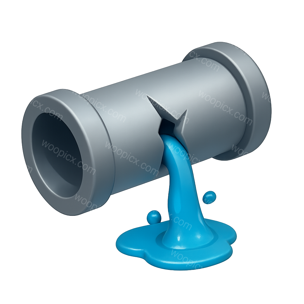 /Premium/Collection: /by davooda/Type: PNG/A 3D representation of a broken pipe with a visible leak. The pipe is gray and features a stream of blue water flowing out, creating a puddle at the base. The isometric view enhances its volumetric appearance.
