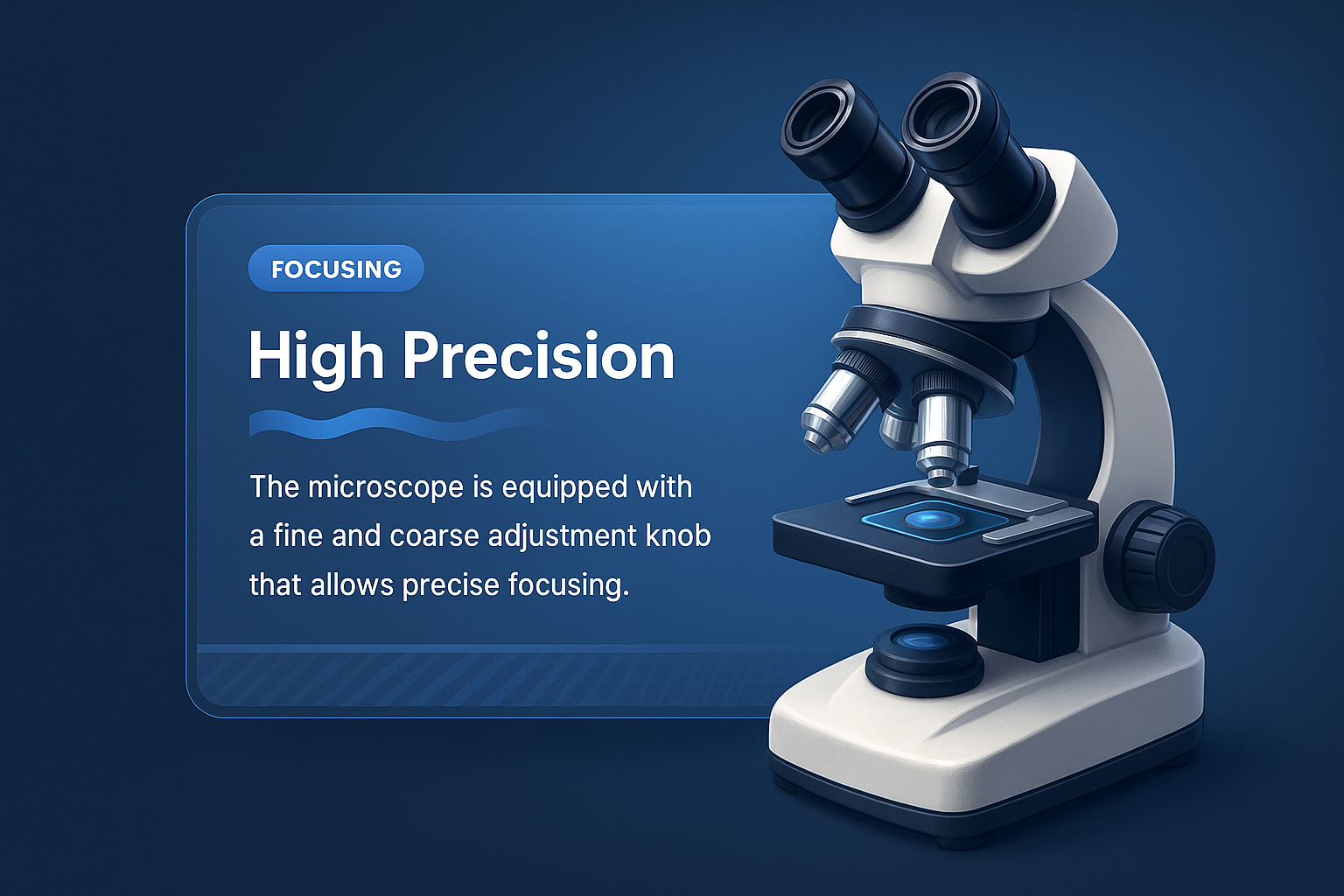 A detailed 3D illustration of a microscope on a smooth gradient background. The design includes a feature block highlighting its precision adjustments.