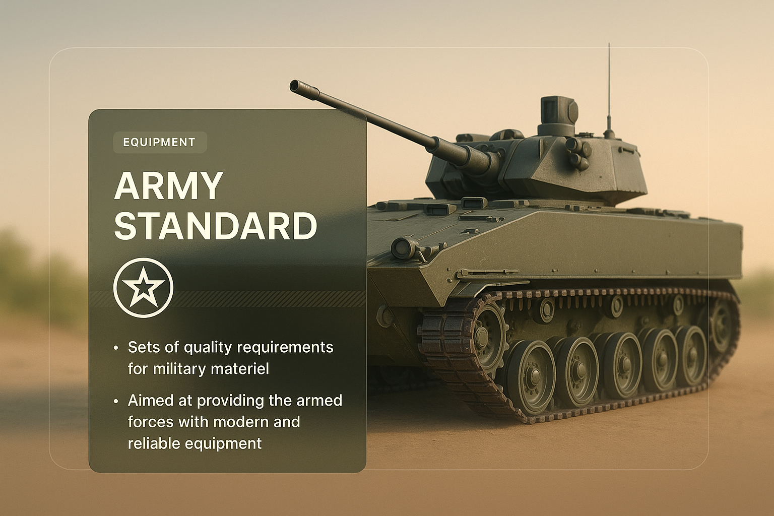 /Collection: /by davooda/Type: PNG/A 3D depiction of military equipment featuring the Army Standard. The design includes a sleek layout with a gradient background, a clear text block, and integrated visual elements.