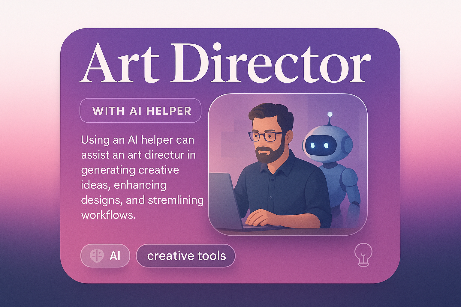 An art director is shown working with an AI helper, illustrating collaboration in design. The background features a gradient, enhancing the modern aesthetic.
