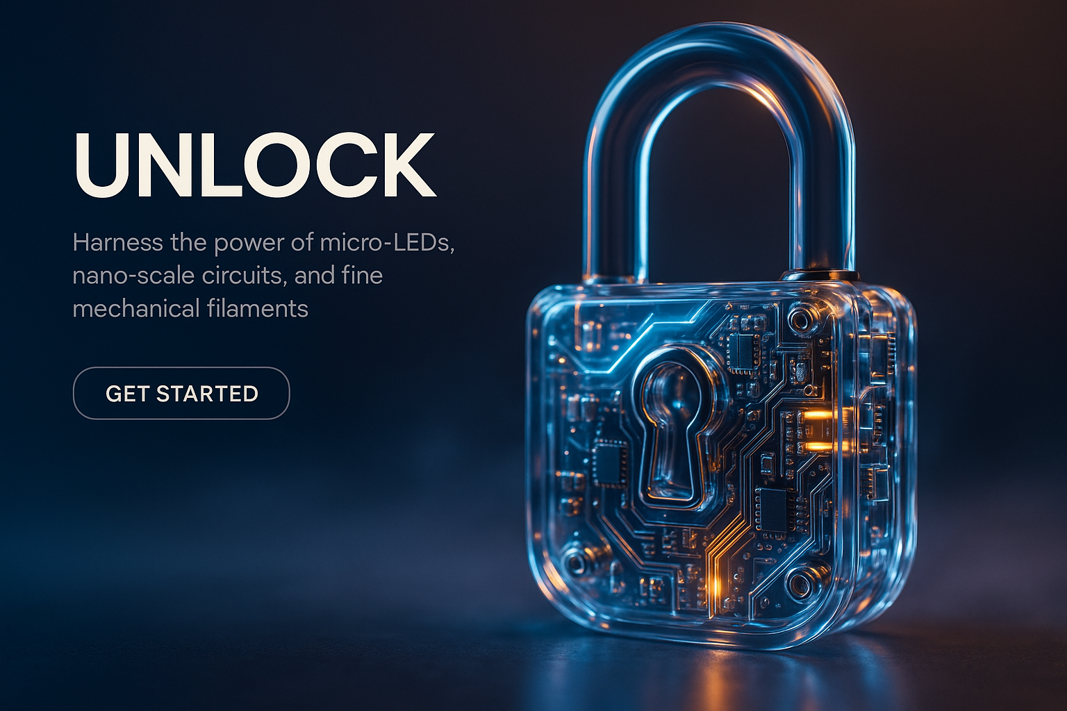/Collection: /by davooda/Type: PNG/A hyperrealistic 3D representation of a lock made from glass-like polymers, showcasing glowing micro-LEDs and intricate mechanical filaments. The lock reflects light with a metallic sheen, set against a gradient backdrop.