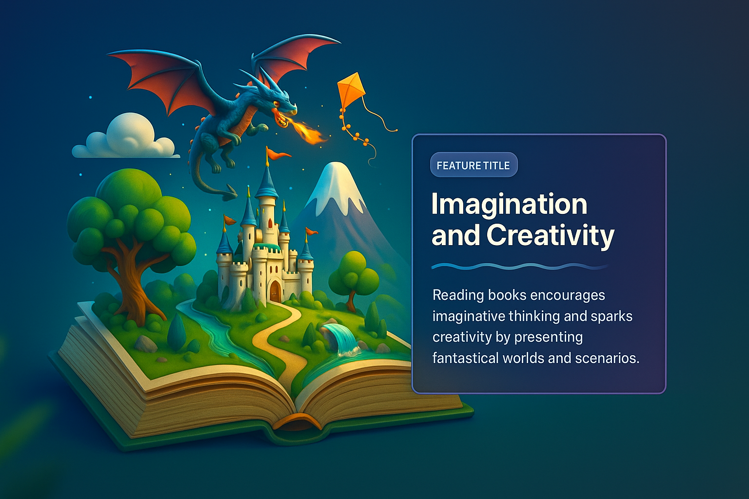 /Collection: /by davooda/Type: PNG/A vibrant 3D illustration of a fantasy world emerging from an open book, featuring a dragon, castle, and lush landscapes, symbolizing the creativity sparked by reading.