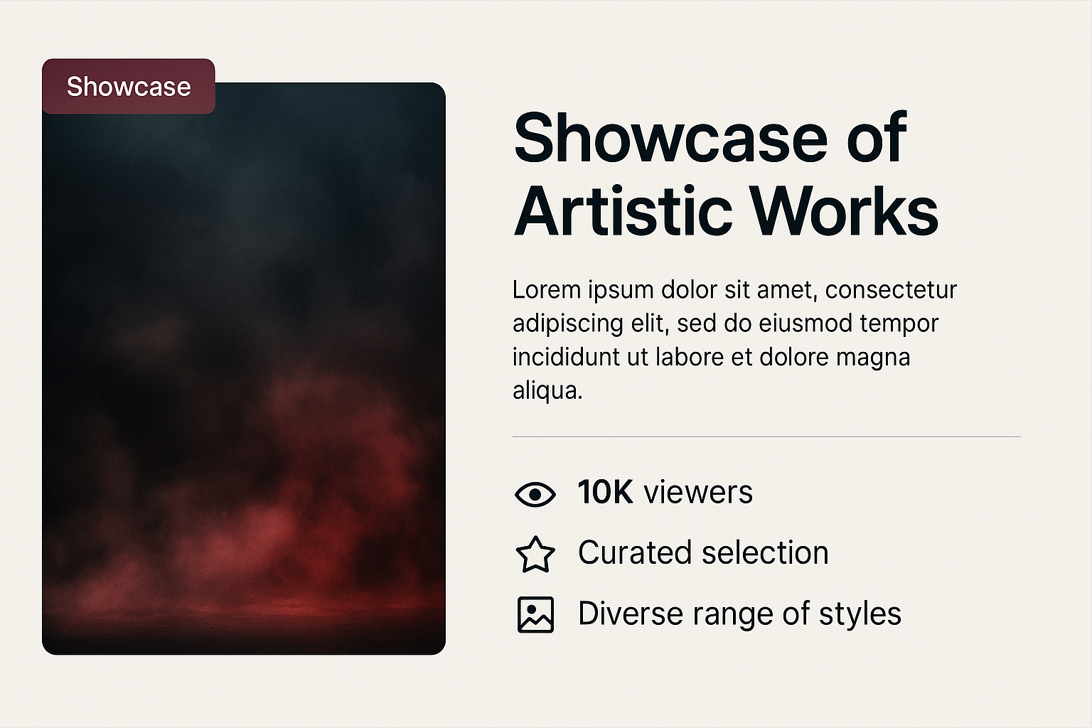 Modern graphic design showcasing artistic works with viewer metrics and curated selection. Ideal for promoting art galleries or exhibitions.