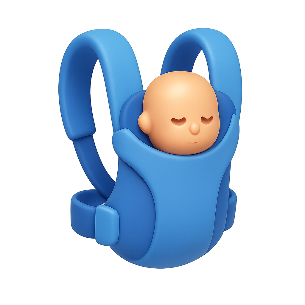 A detailed 3D icon of a baby carrier featuring a stylized baby. The design showcases a blue carrier with a smooth, rounded shape, viewed from a three-quarter angle.