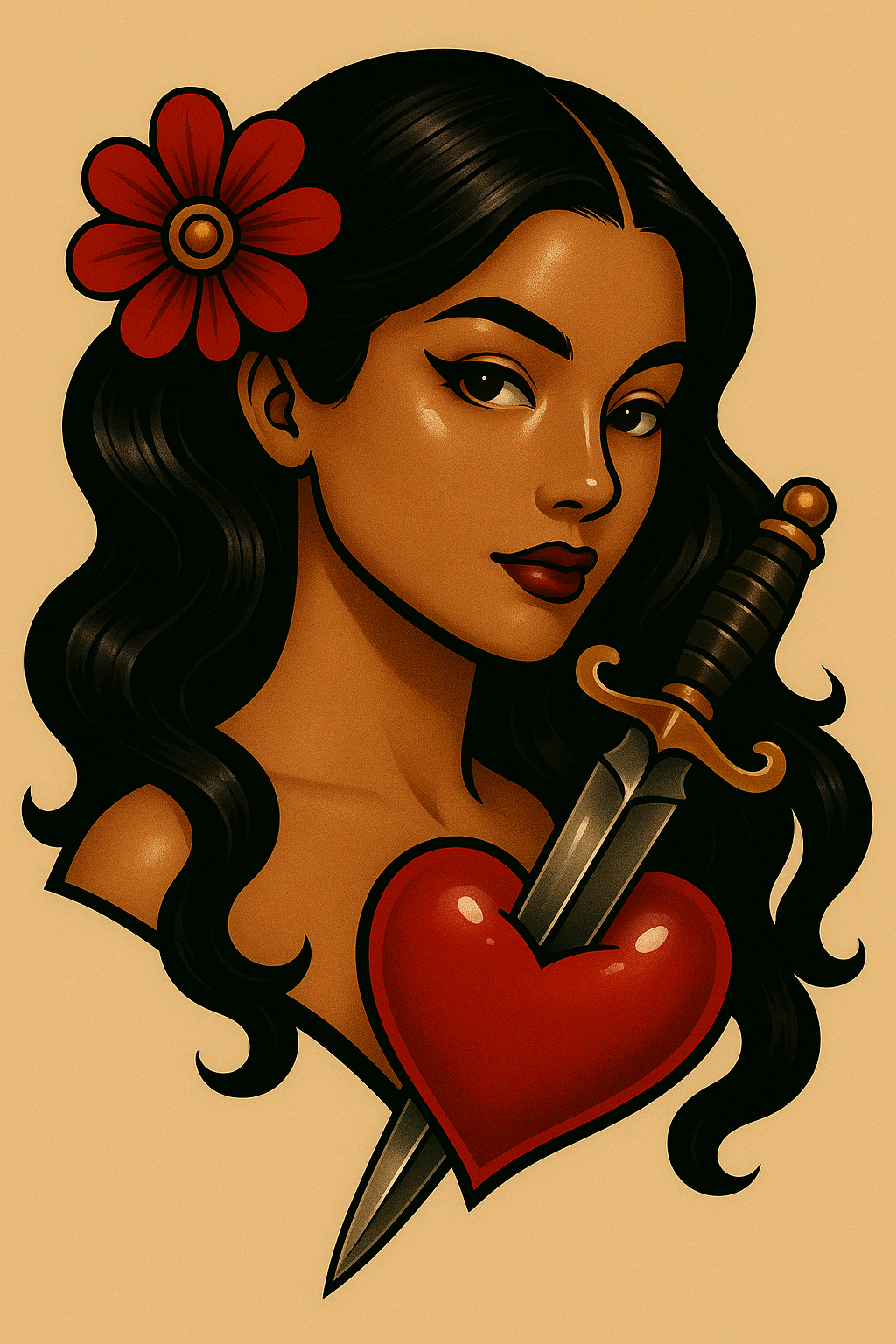 /Collection: /by davooda/Type: PNG/A striking tattoo design featuring a woman with dark wavy hair, holding a dagger piercing a heart, with a flower in her hair. The background is a soft beige, enhancing the glossy anime-inspired style.