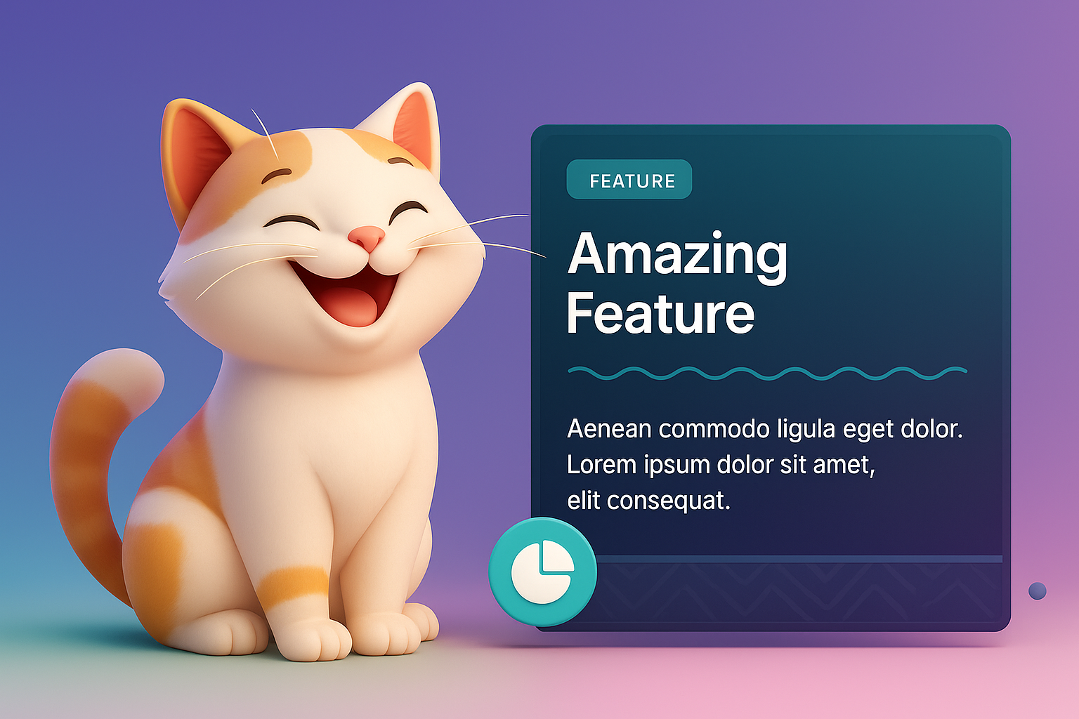 A joyful 3D illustration of a smiling cat against a smooth gradient background. The cat is accompanied by a feature block detailing an amazing aspect, blending seamlessly into the design.