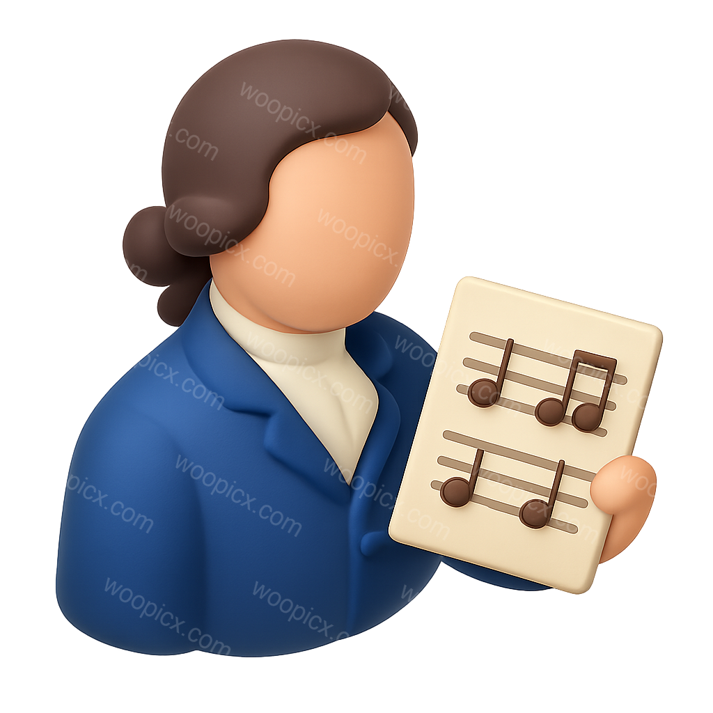 A stylized 3D icon depicting a composer with brown hair, dressed in a blue suit, holding a sheet of music featuring musical notes. Designed with a transparent background.