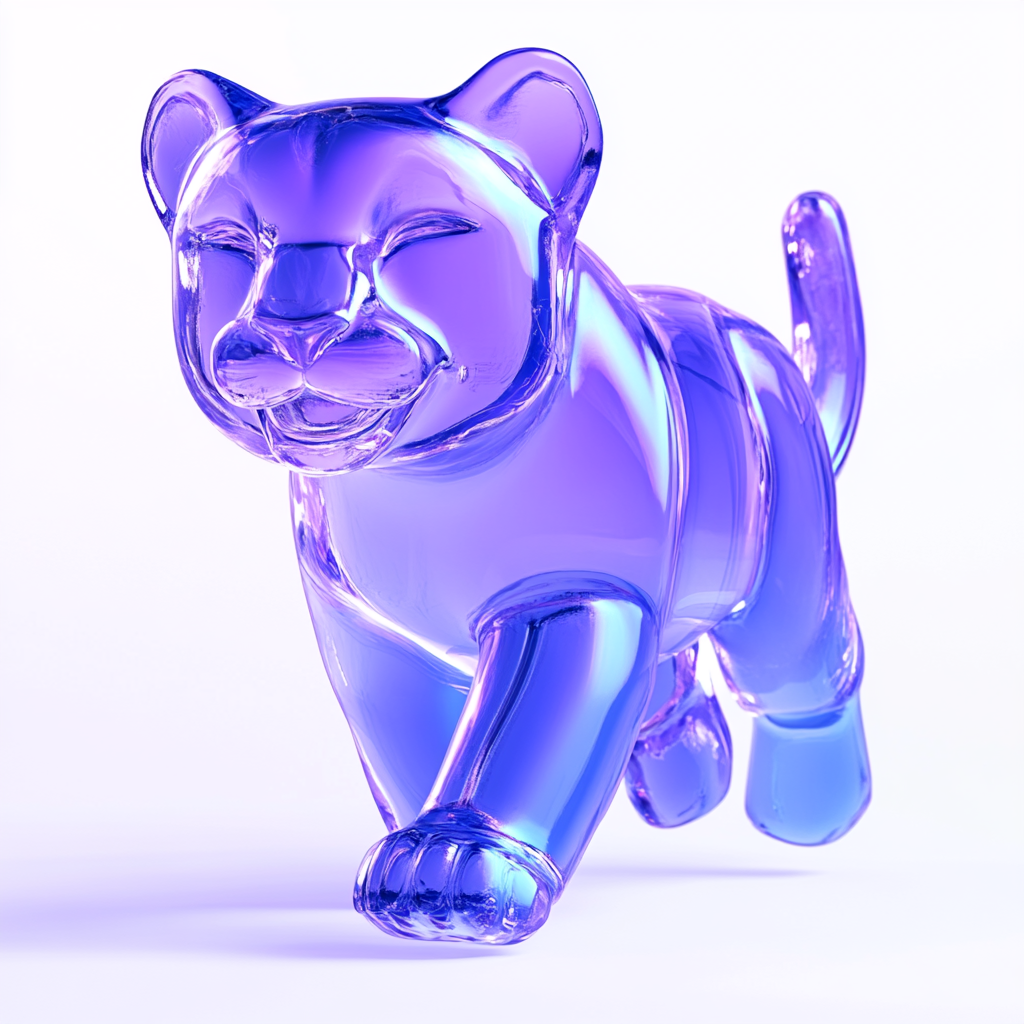 A vibrant translucent glass sculpture of a lion, showcasing a playful and dynamic pose. The use of blue tones creates an eye-catching artistic piece suitable for decorative purposes.