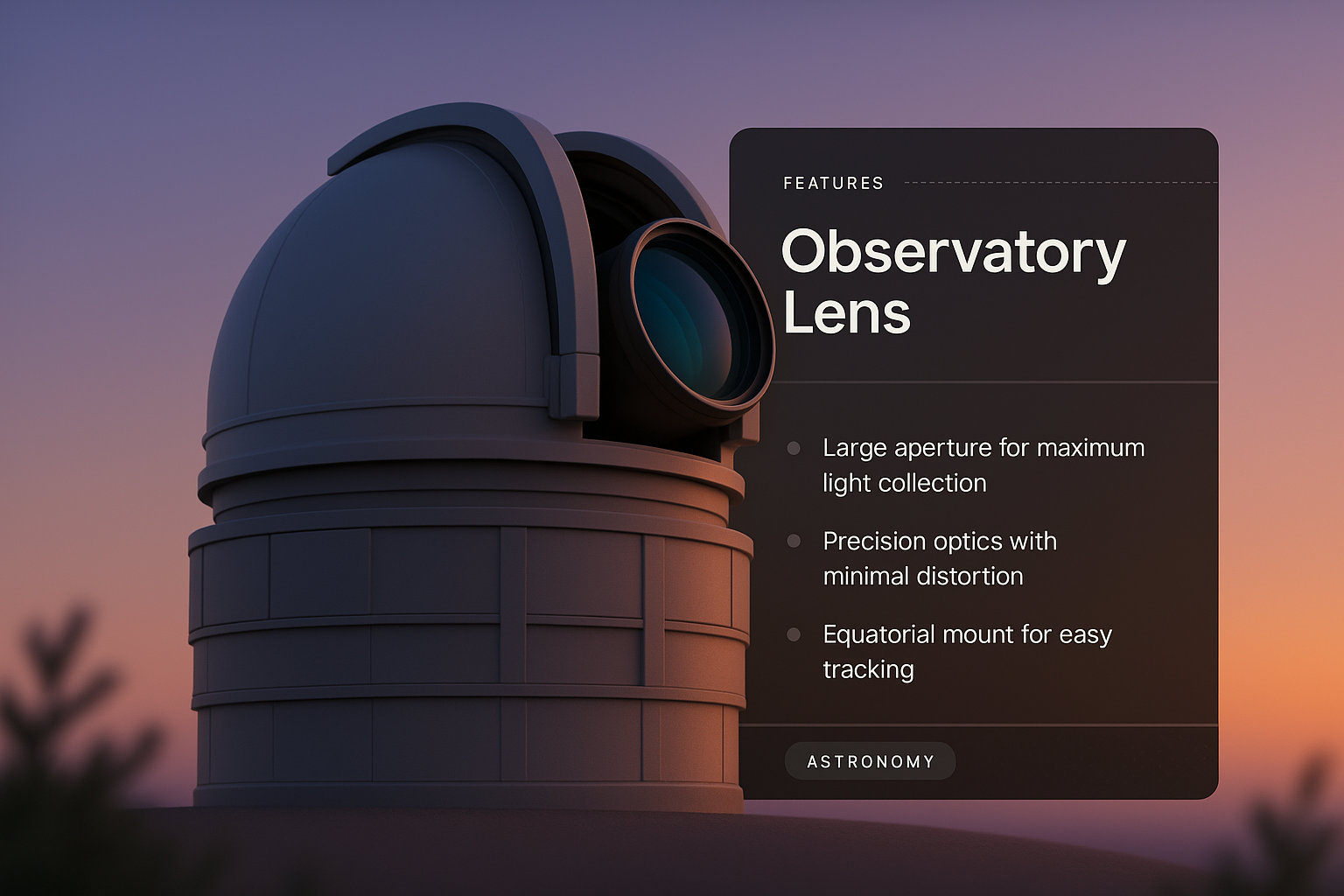 /Collection: /by davooda/Type: PNG/A 3D illustration of an observatory lens, featuring a large aperture for light collection and precision optics. The design includes a dark, integrated text block with features and labels.