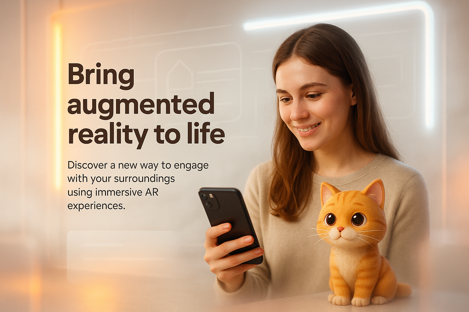 Promotional image showcasing a user interacting with augmented reality on a smartphone, featuring a cute animated character. Suitable for tech marketing and educational content.