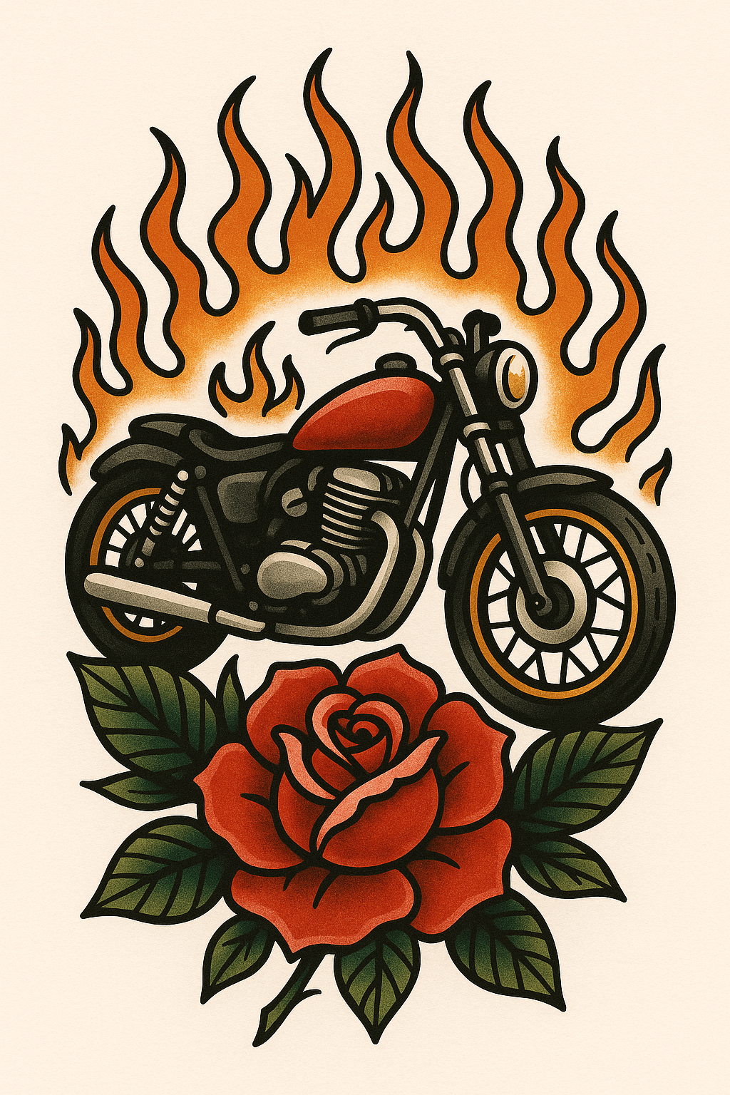 Vintage Motorcycle Illustration with Flames and Rose