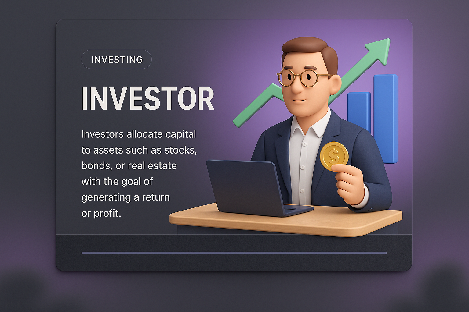 A visually engaging 3D illustration of an investor at a desk with a laptop, holding a coin. The design features a gradient background and graphical elements representing financial growth.