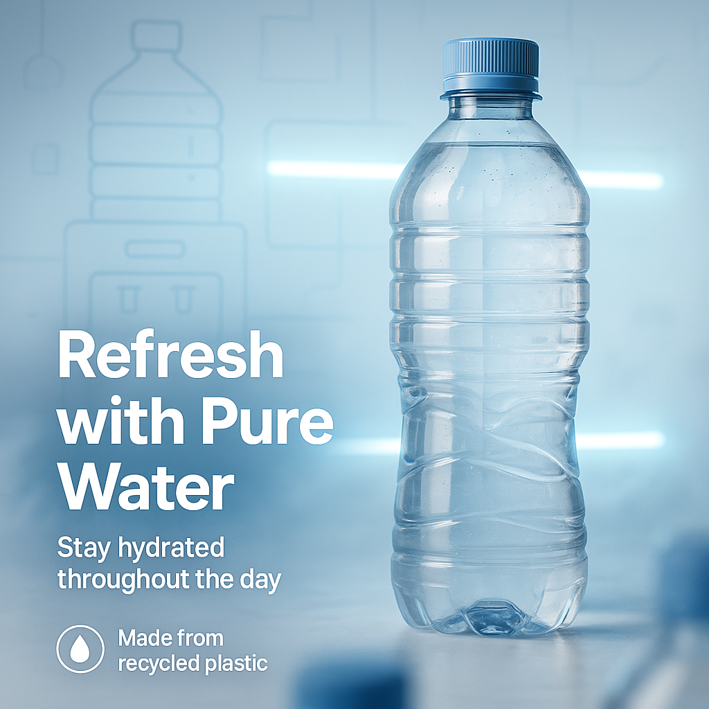 A visually appealing promotional image featuring a clear water bottle made from recycled plastic, emphasizing hydration and sustainability. Ideal for marketing campaigns focused on eco-friendly products.