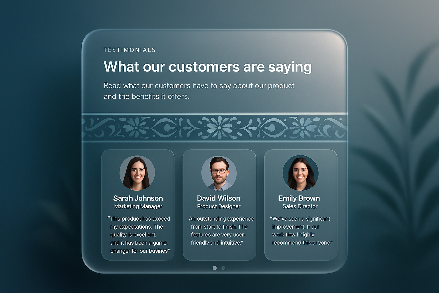 /Collection: /by davooda/Type: PNG/A modern testimonial section featuring circular author photos, names, and text. The design includes a visually appealing gradient background and intricate patterns inspired by Amalfi.