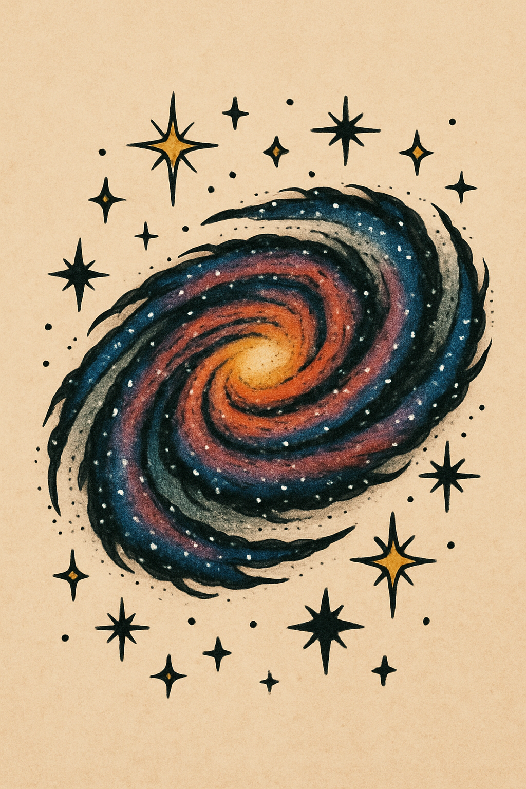 /Collection: /by davooda/Type: PNG/This image features a vibrant, hand-drawn depiction of a galaxy surrounded by stars, set against a beige background. It's ideal for art projects or cosmic-themed designs.