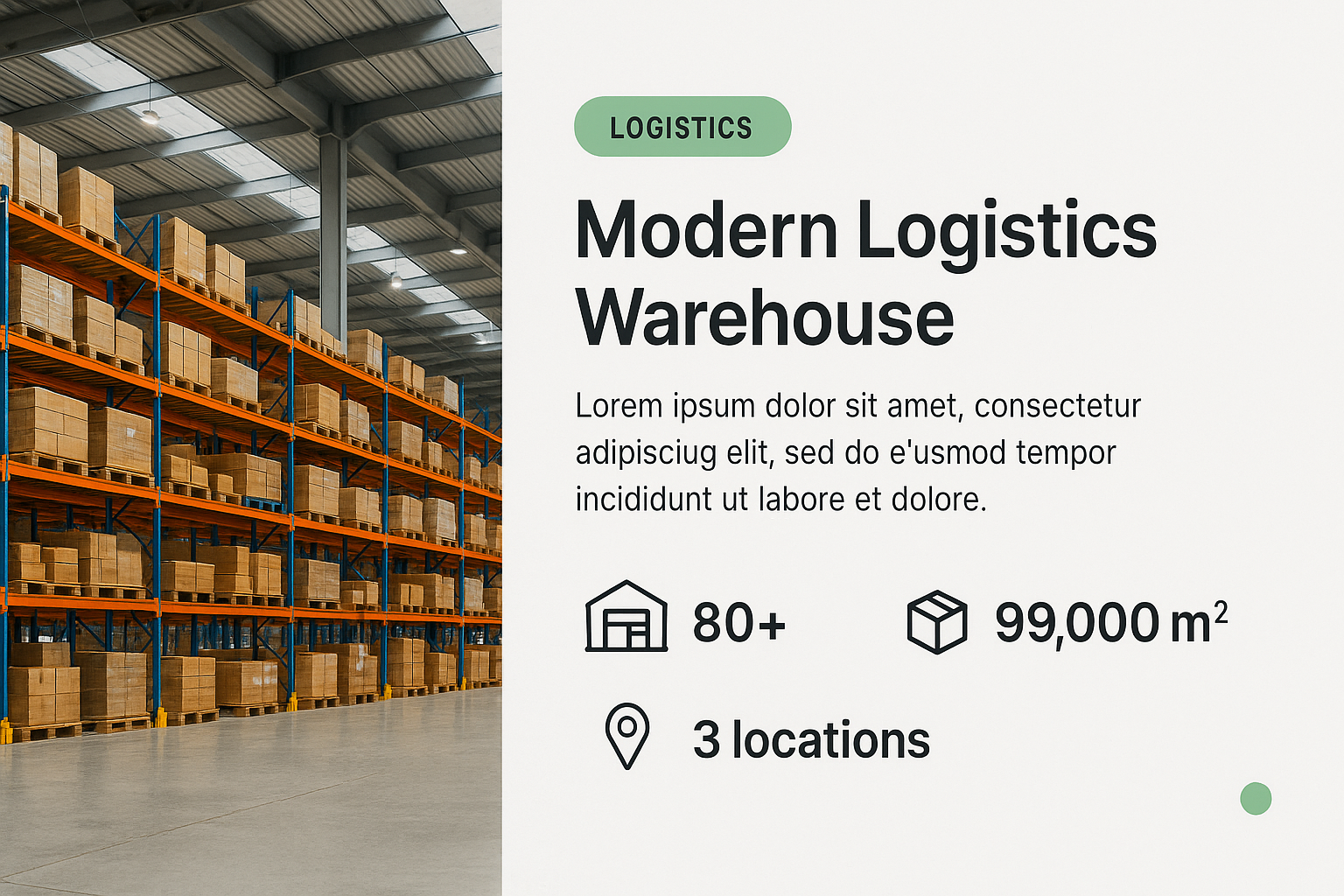 /Collection: /by davooda/Type: PNG/Informative graphic showcasing a modern logistics warehouse with key statistics and design elements, ideal for business presentations or marketing materials.