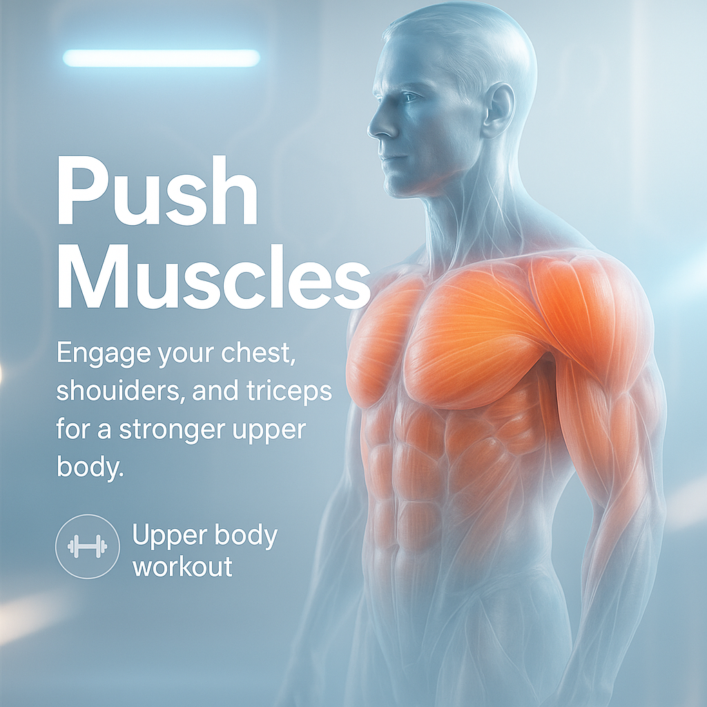 /Collection: /by davooda/Type: PNG/An informative graphic depicting upper body muscles, focusing on push muscles. Ideal for fitness enthusiasts and trainers, this image combines anatomical detail with a modern design.