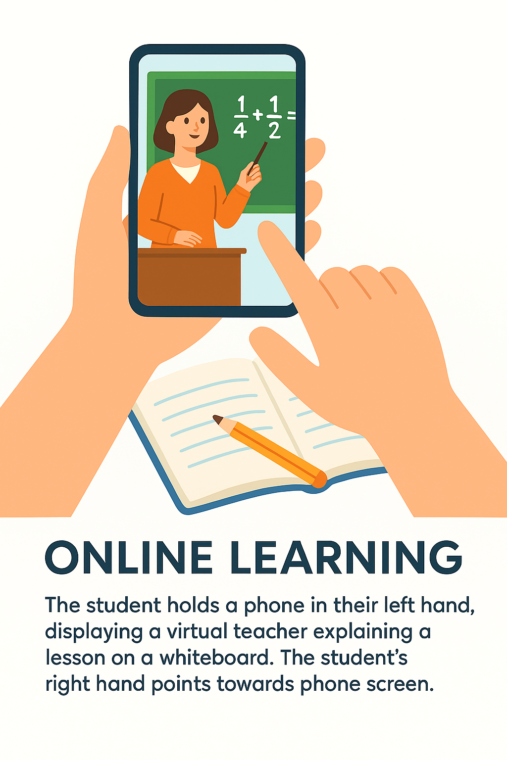 /Collection: /by davooda/Type: PNG/Colorful illustration depicting a student engaging in online learning, showcasing a virtual teacher on a smartphone. Ideal for educational content and digital learning platforms.