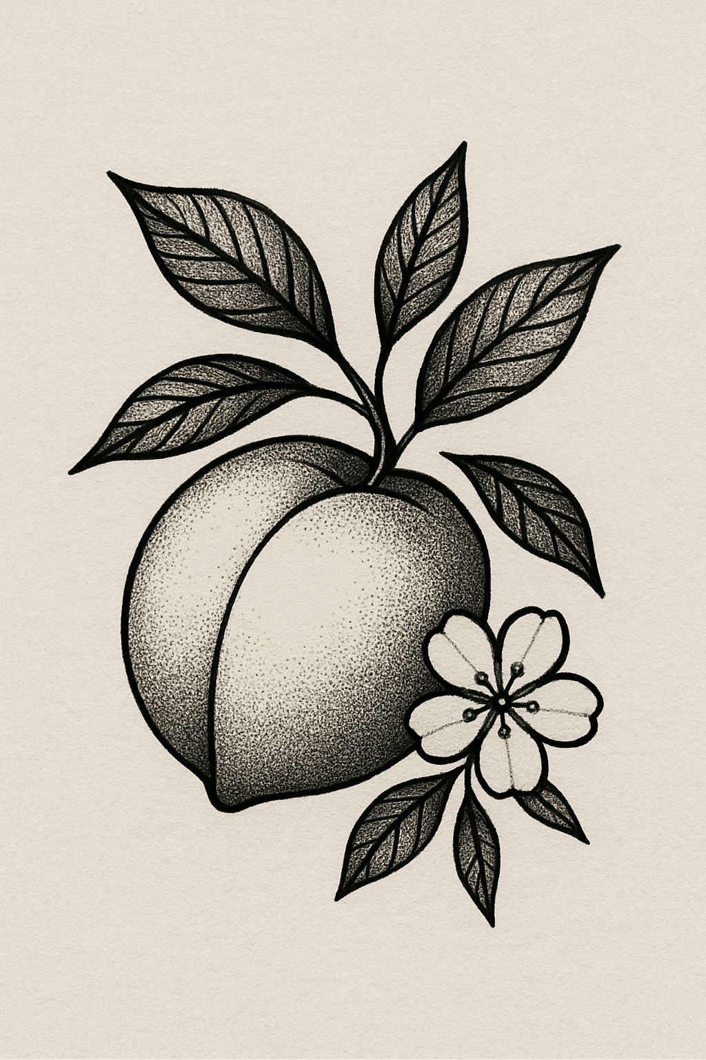 This image features a detailed illustration of a peach with leaves and a flower, showcasing a vintage aesthetic. It's suitable for botanical art prints or branding.