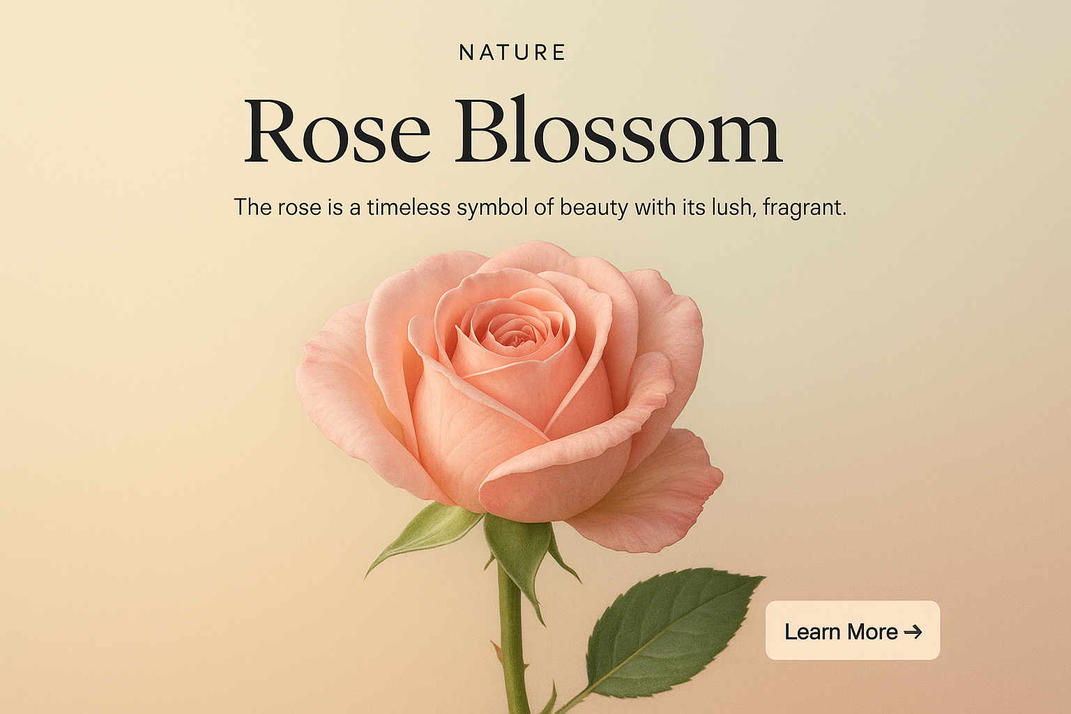 A beautifully rendered realistic rose blossom, set against a soft gradient background. Accompanied by a stylish label, header, and a call-to-action button.