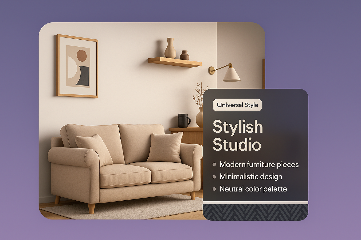 This image showcases a stylish studio apartment featuring a comfortable beige sofa, modern decor, and a minimalist design. The background includes a smooth gradient, enhancing the overall aesthetic.