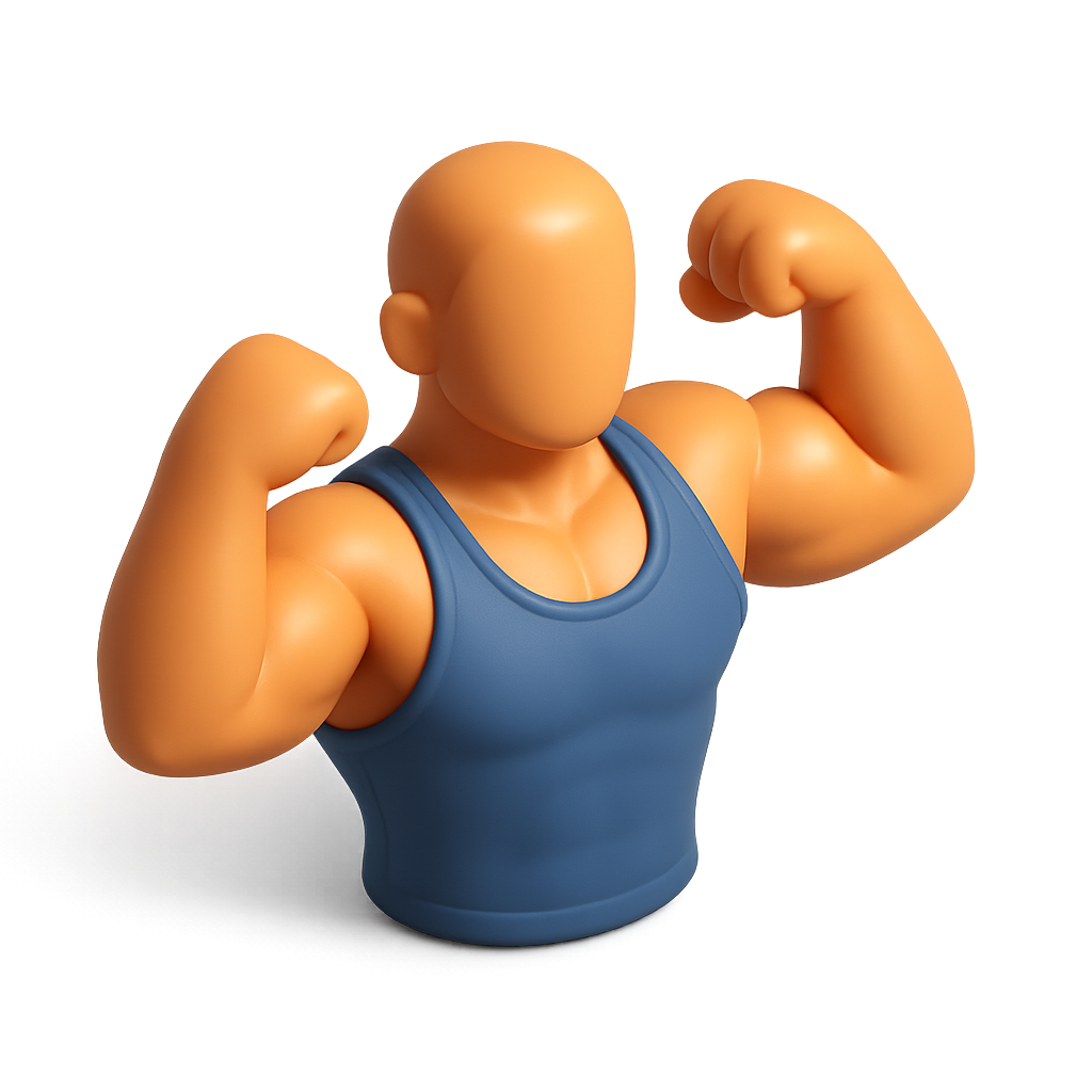 /Collection: /by davooda/Type: PNG/A stylized 3D icon of a bodybuilder in a blue tank top, flexing muscles. The icon features a smooth, volumetric design with a transparent background and a three-quarter view.