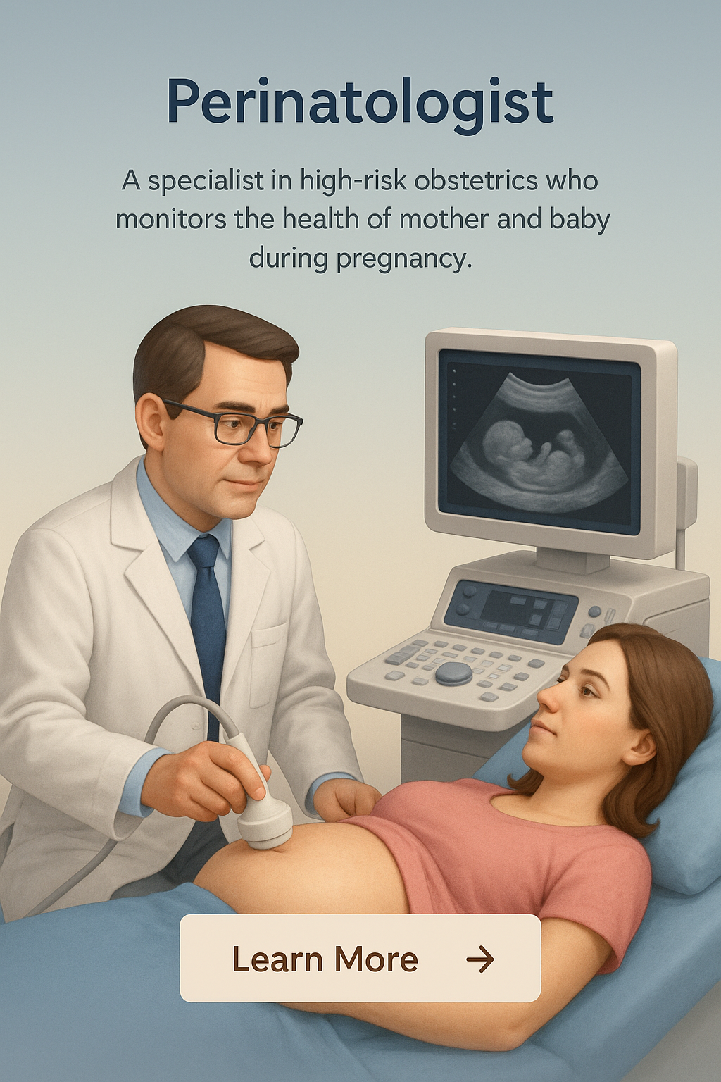 This image features a perinatologist conducting an ultrasound for a pregnant woman. The scene is set in a clinical environment with realistic details.