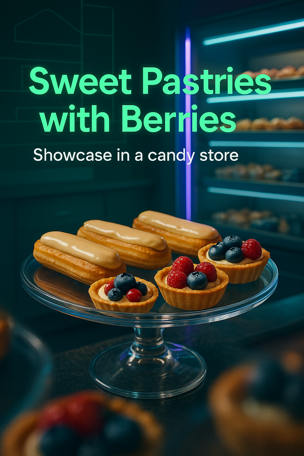 Visually appealing display of sweet pastries featuring berries, perfect for enticing customers in a candy store setting. The vibrant colors and lighting enhance the appetizing look.