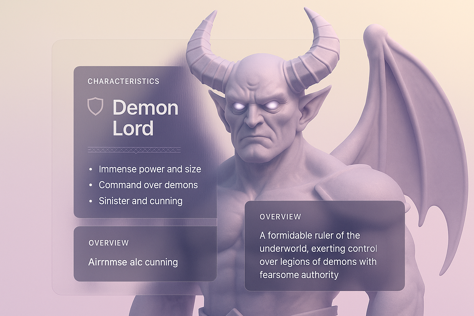 /Collection: /by davooda/Type: PNG/A detailed 3D illustration of a Demon Lord with horns and wings, featuring a light gradient background. Overlay panels provide information about its characteristics.