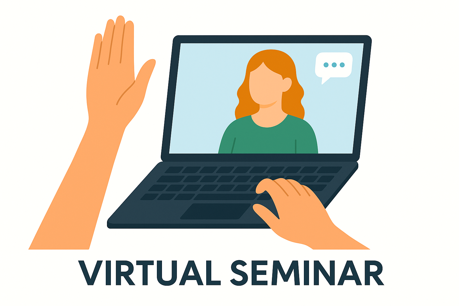 /Collection: /by davooda/Type: PNG/A modern illustration depicting a virtual seminar setup, featuring a laptop with a participant on screen. This graphic is ideal for online event promotions or educational content.