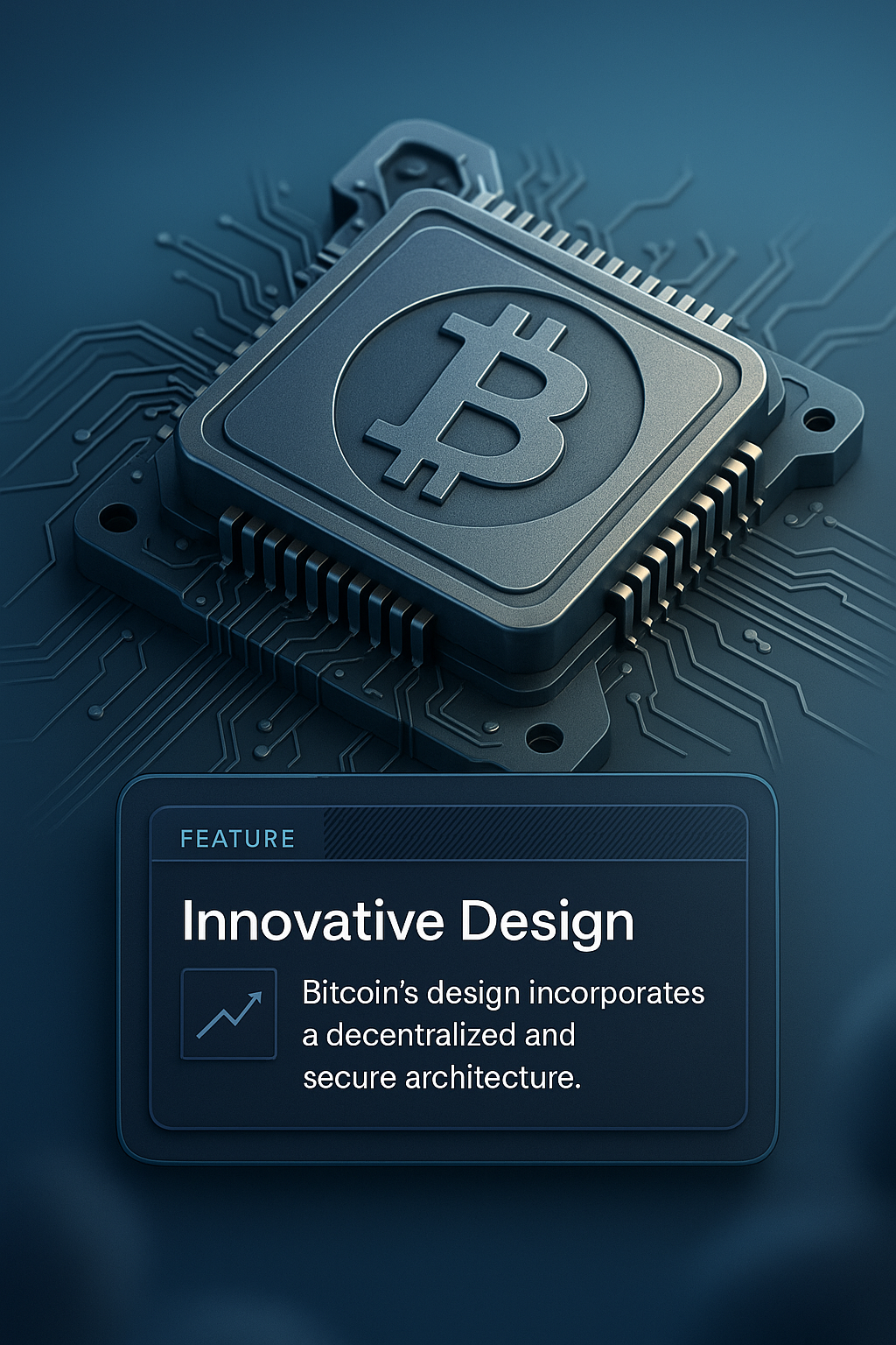 A detailed 3D illustration of a computer chip featuring the Bitcoin symbol. The design showcases innovative features with a cohesive blue gradient background.