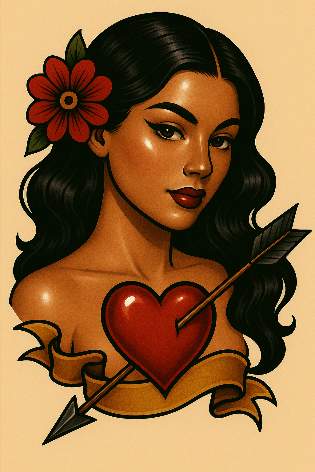/Collection: /by davooda/Type: PNG/This image showcases a glossy, classic tattoo design featuring a woman with flowing hair, adorned with a flower, and an arrow piercing a heart. The composition is artistic with a beige background.