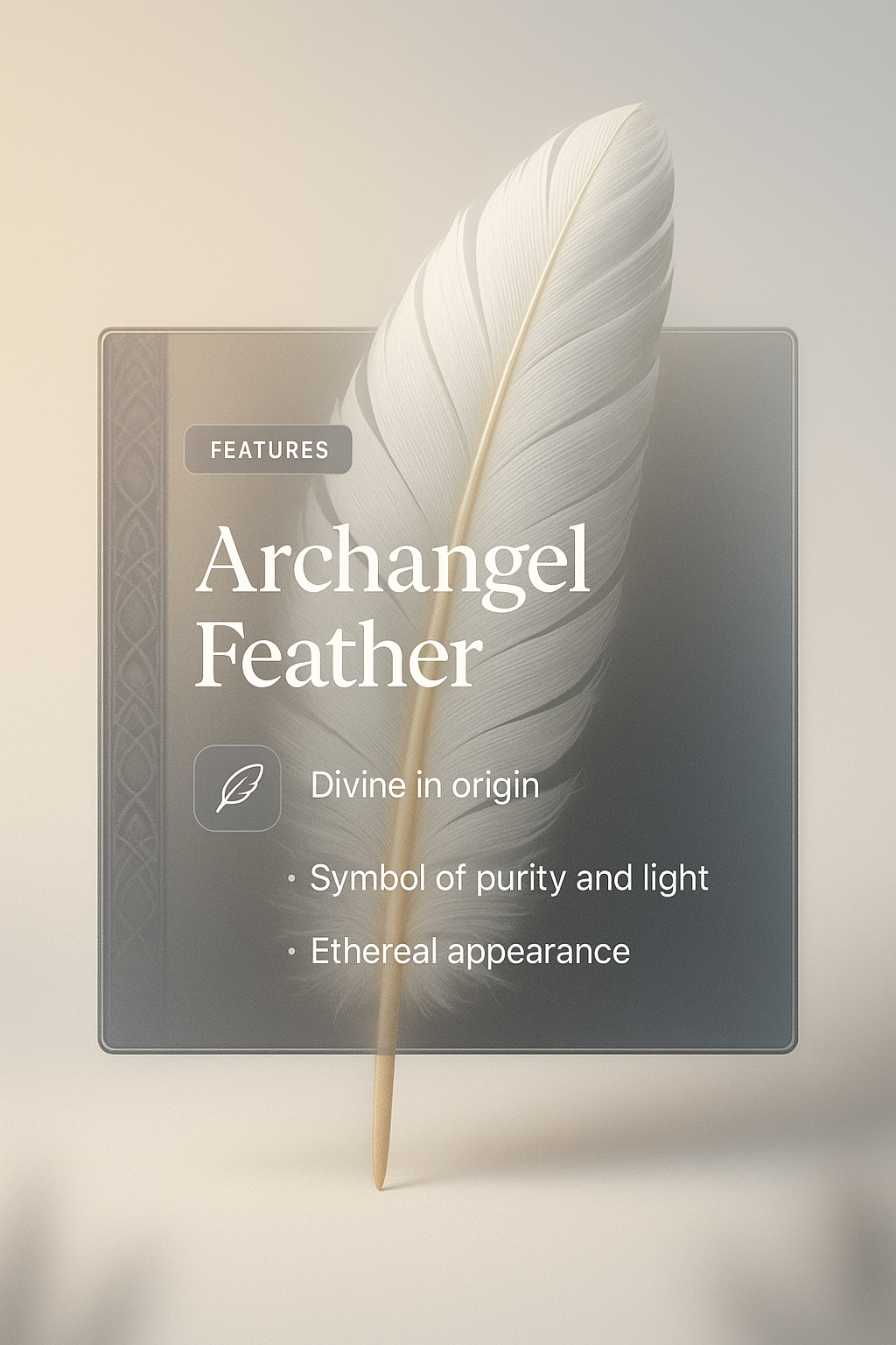 /Collection: /by davooda/Type: PNG/A beautifully designed image featuring an archangel feather, complemented by a translucent panel displaying its ethereal qualities. The soft gradient background enhances the divine theme.